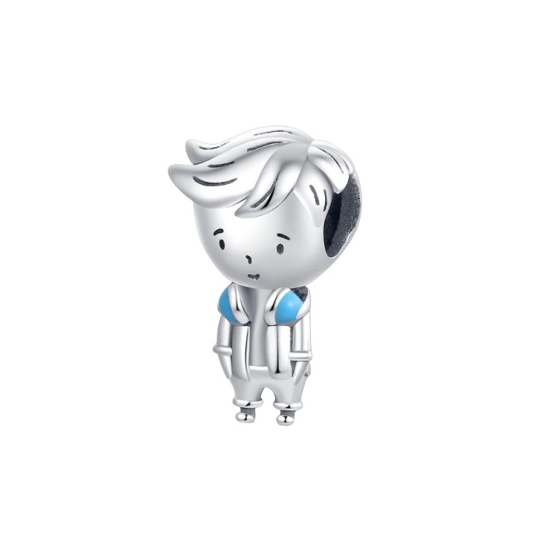 Abalorio fabricado en plata de ley 925 mm, con diseño de niño con cascos azules. Agujero de 5 mm compatible con diversas marcas de pulseras, como Pandora, Chamilia, etc... Se entrega en estuche de regalo.