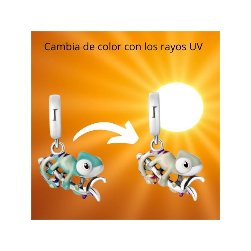 Abalorio charm fabricado en plata de ley 925 mm, diseñado en forma de camaleón, con agujero de 5 mm que lo hace compatible con diversas marcas de pulseras como Pandora, Chamilia, etc .. Está lacado con un material foto sensible, que al contacto con los rayos UV del sol, cambia de color. Charm ideal y novedoso. Se entrega en estuche de regalo.
