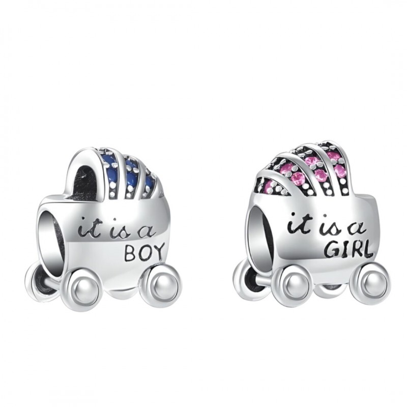 Abalorio charm fabricado en plata de ley 925 mm, en forma de carro de bebé. La capota, esta formada por circonitas azules o rosas, y con la inscripción en inglés "es un chico" o "es una chica", a elegir en el momento de la compra. Compatible con todas las marcas de pulseras incluída Pandora, por su agujero de 5 mm de diámetro. Se entrega en estuche de regalo. Entregas rápidas en 24-72 horas laborables a península.