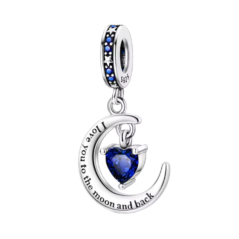 ABALORIO CHARM PLATA DE LEY MEDIA LUNA CORÁZON AZUL CENTRAL COLGANDO MENSAJE DE AMOR,AGUJERO DE 5 MM