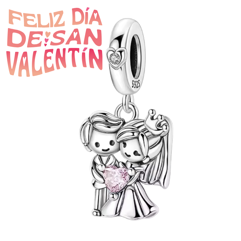 ABALORIO CHARM BAÑADO PLATA DE LEY PAREJA RECIEN CASADOS CORAZÓN CIRCONITA ROSA