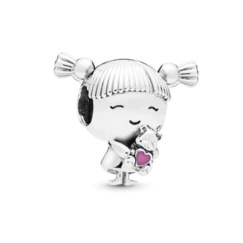 Abalorio fabricado en plata de ley, en forma de niña con coletas y osito en los brazos.Agujero de 5 mm de diámetro, que es compatible con diferentes marcas de pulseras, como Pandora, Chamilia, etc... Se entrega en estuche de regalo.