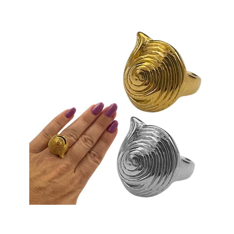 Anillo de acero inoxidable con diseño de caracola y ajuste adaptable por su parte inferior. Disponible en dos acabados: plateado o bañado en oro 18k. Entrega rápida en 24 a 72 horas laborables a península. Envío gratis desde 20 euros. Estuche de regalo incluido. Ideal para cualquier ocasión.