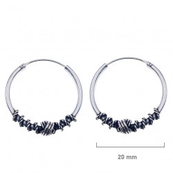 Argollas fabricadas en plata de ley 925 mm, estilo balinesas, de 2 cm de diámetro. Cierre de bisagra y palillo que se introduce en la misma argolla. El precio indicado es de una pareja. Se entregan en estuche de regalo.
