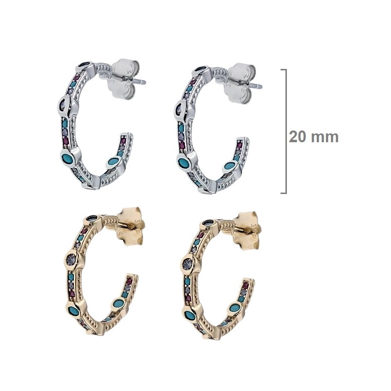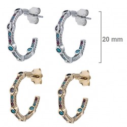 Argollas-aros fabricados en plata de ley de 20 mm de diámetro, con cierre de presión tipo mariposa, con circonitas de colores embutidas en la pieza. Disponible con dos acabados diferentes a elegir en el momento de la compra: plateados o bañados en oro de 18k. Se entregan en estuche de regalo. El precio indicado corresponde a una pareja. Envíos rápidos en 24-72 horas laborables a península.