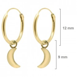 Argollas aros fabricados en plata de ley 925 milésimas bañadas en oro de 18 kilates. Cuentan con un cierre de tipo bisagra y palillo que se introduce dentro de la misma argolla . De 12 mm de diámetro, le cuelga una luna plana de 9 mm de altura.El precio indicado corresponde a una pareja. Se entrega en estuche de regalo. Envíos rápidos en 24-72 horas laborables a península.