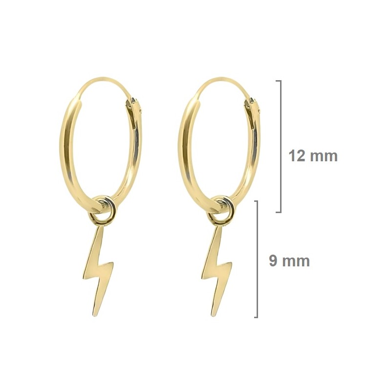 Argollas aros fabricados en plata de ley 925 milésimas bañados en oro de 18 kilates formados por una bisagra y parillo que se introduce dentro de la misma argolla para cerrarla . La argolla cuenta con 12 mm de diámetro y 1,2 mm de grosor y le cuelga un Rayo de 9 mm de altura . Se entrega en estuche de regalo . Envíos rápidos a península en 24-72 horas laborables .