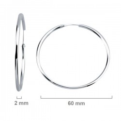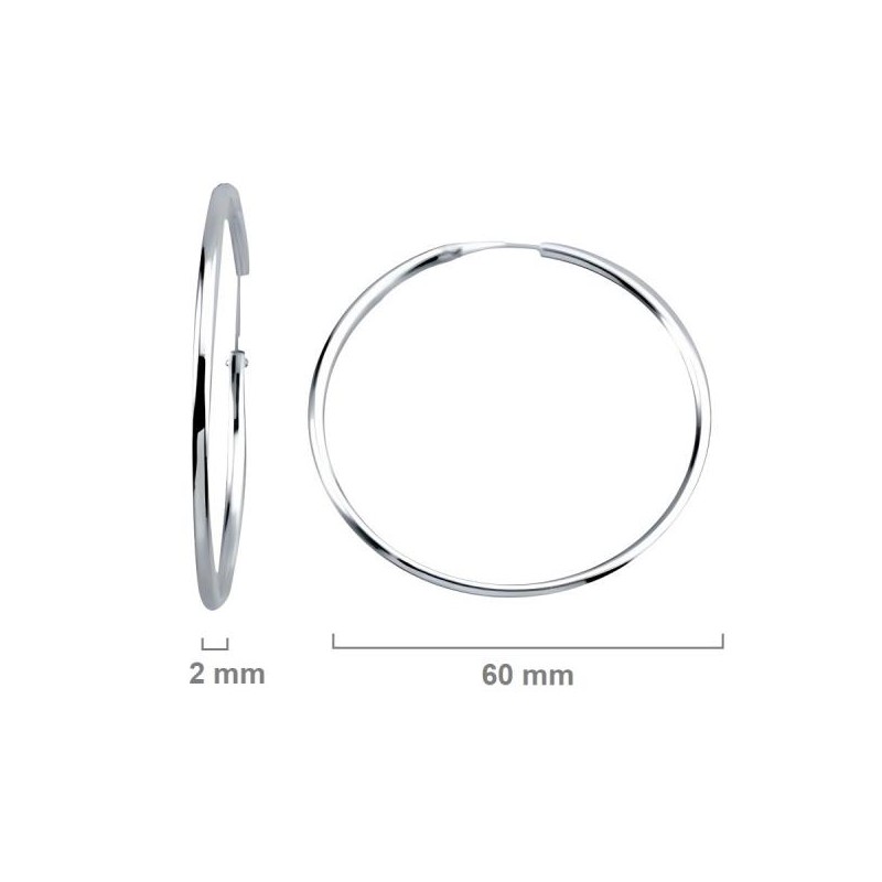 Argollas aros fabricados en plata de ley 925 milésimas, media caña, de 2 mm de grosor y 60 mm de diámetro. Cuenta con un cierre de bisagra y palillo que se introduce dentro de la misma argolla. Se entrega en estuche de regalo. Envíos rápidos a península en 24-72 horas laborables.