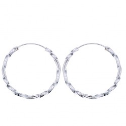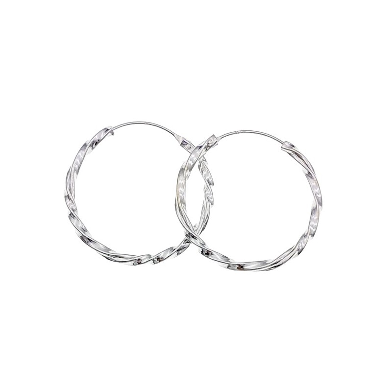 Argollas fabricadas en plata de ley 925 mm, en forma de tubo retorcido sobre sí mismo. 2.5 cms de diámetro. Cierre de palillo embutido en la misma argolla.