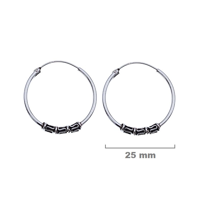 Argollas aros fabricados en plata de ley 925 milésimas estilo balinés de 2.5 cm de diámetro . Cierre de bisagra y palillo que se introduce dentro de la misma argolla . Se entregan en estuche de regalo. Envíos rápidos en 24-72 horas laborales a península.