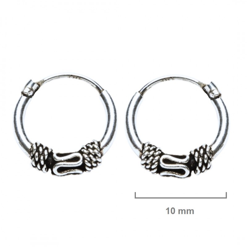 Argollas aros fabricados en plata de ley 925 mm, estilo bali, con una greca en su parte central y varias vuelta de hilo de plata a ambos lados. Dimensiones: 10 mm de diámetro. Cuenta con un cierre de palillo que se introduce en la misma argolla. Se entrega en estuche de regalo. Entregas rápidas en 24-72 horas laborables a península.