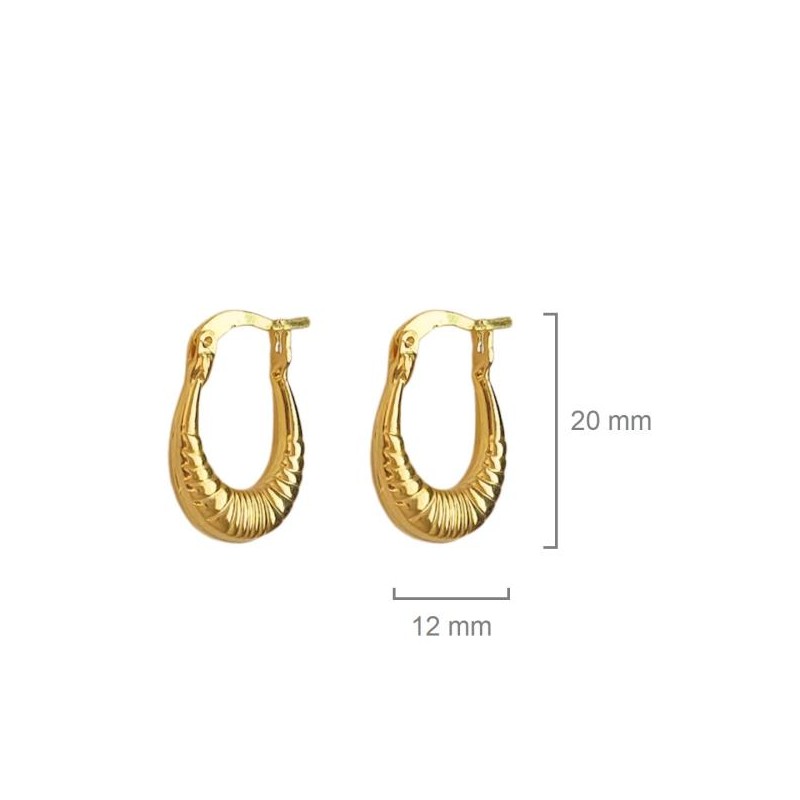 Argollas o aros fabricados en plata de ley 925 milésimas bañados en oro de 18 quilates. Cuenta con un diseño tipo morcilla con ondas por ambas caras. Dispone de un cierre de clip para mayor comodidad en su colocación. Dimensiones: 20 mm de altura por 12 mm de anchura. Se entrega en estuche de regalo. Envíos rápidos en 24-72 horas laborables.