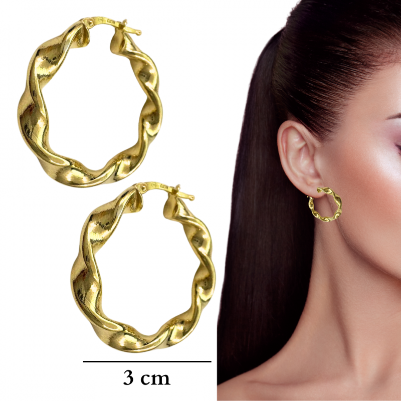ARGOLLAS PLATA DE LEY BAÑADAS ORO 18K RIZADAS DE 3 CM DE DIÁMETRO Y 4 MM DE GROSOR. CIERRE DE BISAGRA Y CLIP.