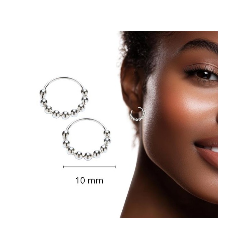 Aros de plata de ley con diseño clásico y bolitas decorativas. Diámetro de 10 mm, perfectos para un estilo discreto y elegante. Ideales para uso diario o como segundo pendiente. Se entregan en estuche de regalo. Entregas rápidas en 24 a 72 horas laborables a península. Envío gratis en compras superiores a 20 euros. Envío de 3 euros para pedidos menores.