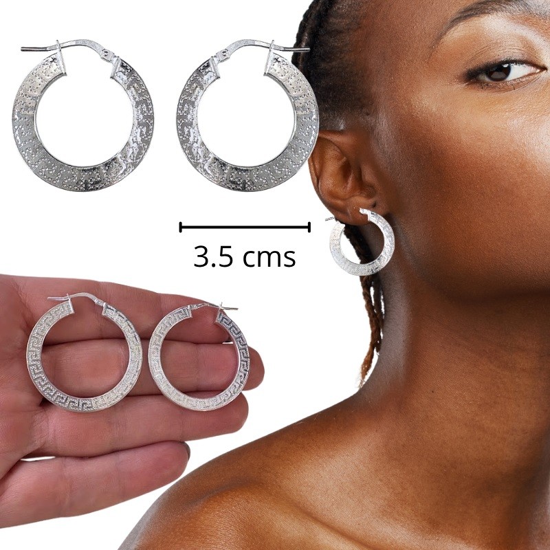 Argollas aros de plata de ley con diseño greca y cierre clip. Modelo plano, elegante y cómodo, de 2 mm de grosor y 3.5 cm de diámetro. Entregas rápidas en 24 a 72 horas laborables a península. Se entregan en estuche de regalo. Envío gratis en compras desde 20 euros. Resto de pedidos 3 euros.