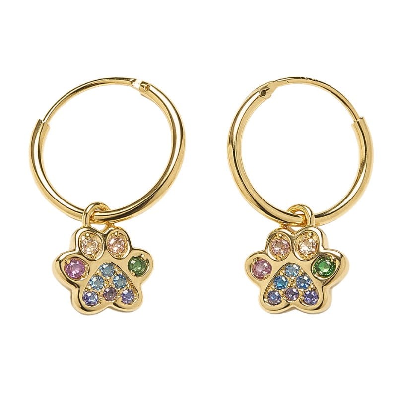 Argollas de plata de ley bañadas en oro 18K con colgante de huella y circonitas multicolor. Diseño delicado y brillante ideal para amantes de las mascotas. Se entregan en estuche de regalo. Entregas rapidas en 24 a 72 horas laborables en peninsula. Envio gratis desde 20 euros. Resto de pedidos 3 euros