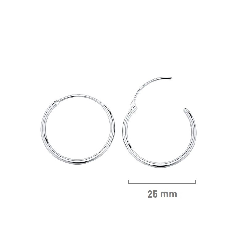 Argollas fabricadas en plata de ley 925 mm, de 1.5 mm de grosor, tipo tubo hueco, y de 2.5 cms ( 25 mm) de diámetro. El cierre cuenta con un palillo y bisagra que facilita su colocación. El precio indicado es de una pareja. Se entregan en estuche de regalo.
