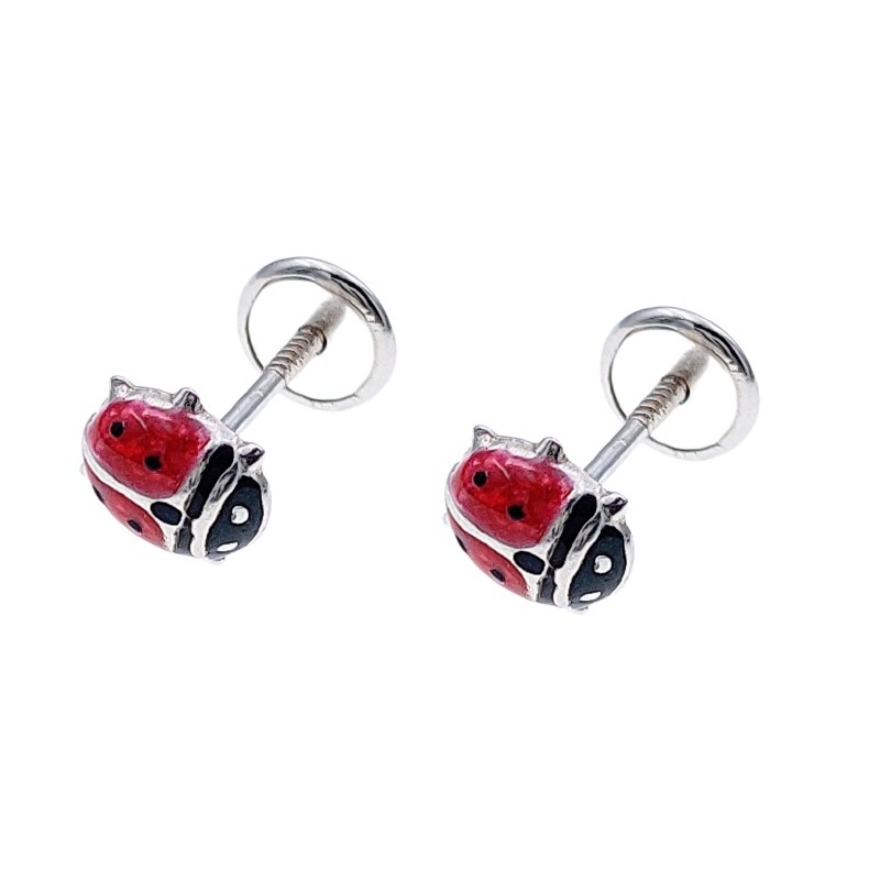 Pendientes fabricados en plata de ley 925 mm, en forma de mariquitas, con cierre de rosca que aporta mayor seguridad y evita que se los claven a la hora de dormir. El precio indicado es de una pareja. Se entregan en estuche de regalo.