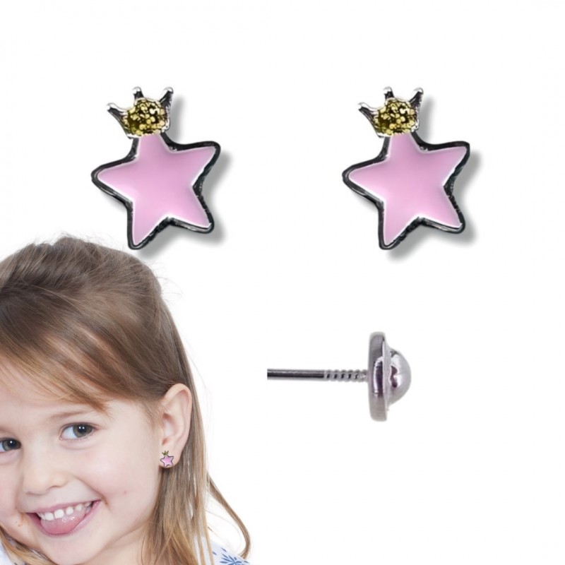 Pendientes fabricados en plata de ley 925 mm, en forma de estrellas rosas con corona con cierre de rosca, que evita su perdida. Se entrega en estuche de regalo. Entregas rápidas en 24-72 horas laborables a península.