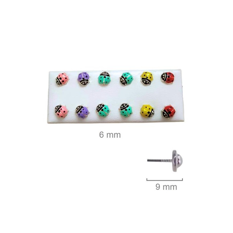 Pendientes fabricados en plata de ley 925 milésimas con cierre de rosca que impiden perdidas y daños mientras se duerme. Diseñados en forma de mariquitas lacadas en diferentes colores. Dimensiones: 6 mm de ancho x 6 mm de alto. El precio indicado corresponde a una pareja. Se entregan en estuche de regalo. Envíos rápidos a península en 24-72 horas laborables.