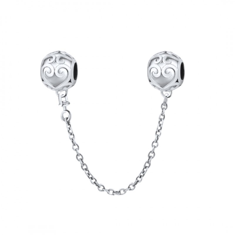 CADENA SEGURIDAD PLATA DE LEY DOS BOLAS LABRADAS FILIGRANA CORAZÓN AGUJERO DE 5 MM COMPATIBLE CON PANDORA