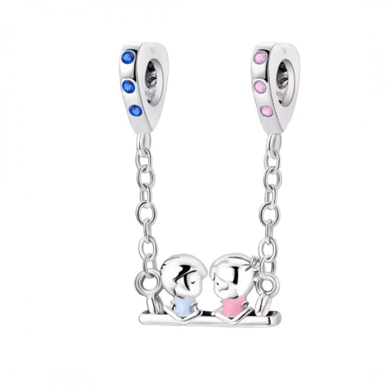 CADENA DE SEGURIDAD PLATA DE LEY NIÑO Y NIÑA SENTADOS EN COLUMPIO, AGUJERO DE 5 MM