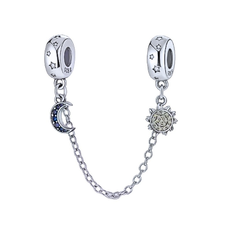 Cadena de seguridad de plata de ley con luna y sol colgando, ideal para proteger tu pulsera con un diseno elegante y simbolico. Perfecta para charms y pulseras de plata. Entregas rapidas en 24 72 horas laborables a peninsula. Se entrega en estuche de regalo. Envio gratis desde 20 euros y resto 3 euros.