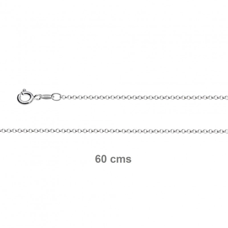 Cadena fabricada en plata de ley 925 mm, de 60 cms de longitud y cierre de tipo mosquetón, para mayor seguridad. Cuenta con diseño llamado "rolo" con una forma de eslabones entrelazados redondos de 2,5 mm de diámetro. Se entrega en estuche de regalo. Envío en 24-48 horas laborables.