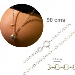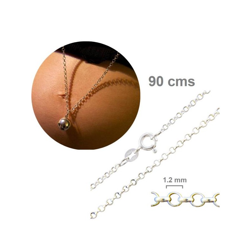 Cadena fabricada en plata de ley 925 milésimas 90 cm de longitud formada por un tipo de eslabon denominado: rolo de 1.2 mm de grosor. Cuenta con un cierre de mosquetón redondo de seguridad. Se entrega en estuche de regalo. NO INCLUYE EL LLAMADOR DE ANGEL. Cadena ideal para llevar llamador de ángel en embarazadas, ya que el llamador suena sobre la barriga de la futura mamá. Envíos rápidos a península en 24-72 horas laborables.