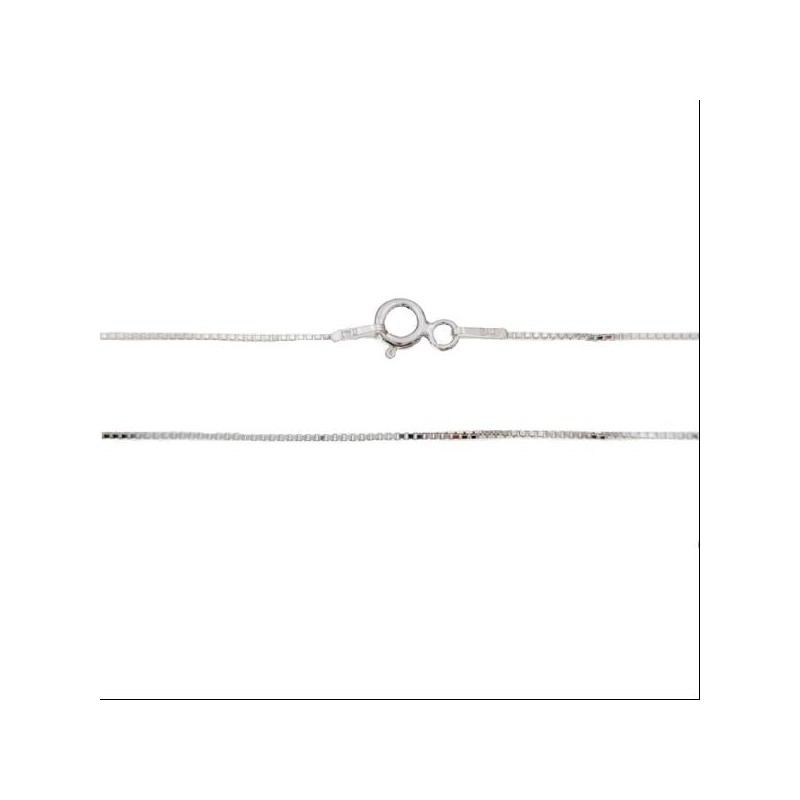 Cadena fabricada en plata de ley 925 mm, en forma de cordoncillo cuadrado de 1 mm de grosor y 40 cms de longitud. Cierre de mosquetón.