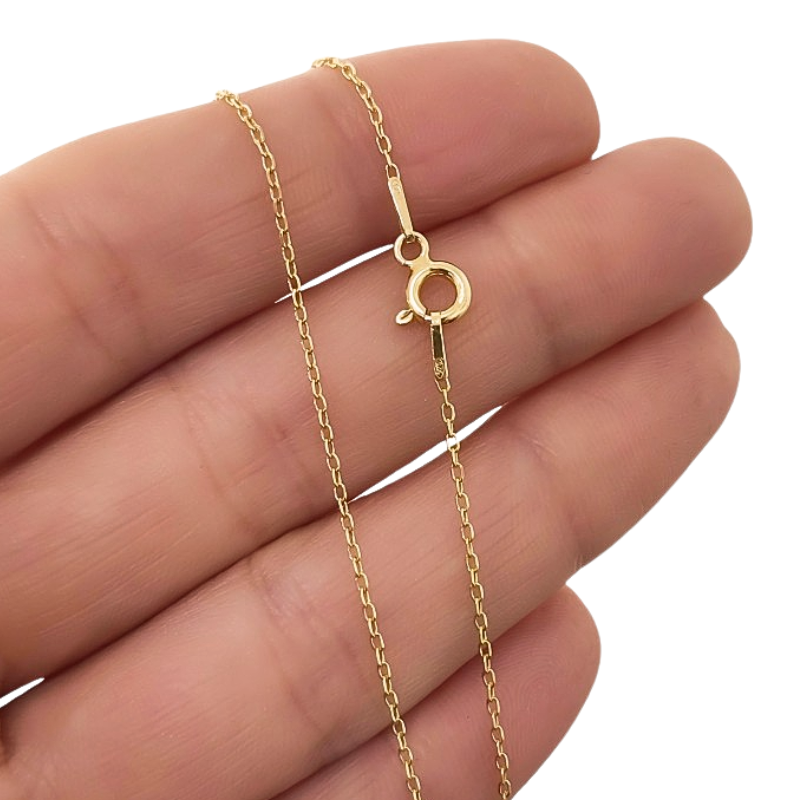 Cadena de plata de ley de 40 cm con baño de oro de 18 quilates, eslabón forzado de 1 mm de grosor y cierre mosquetón redondo. Elegante, fina y versátil, perfecta para combinar con colgantes o llevar sola. Entregas rápidas en 24 a 72 horas laborables a península. Se entrega en estuche de regalo. Envío gratuito desde 20 euros. Coste estándar de envío 3 euros.