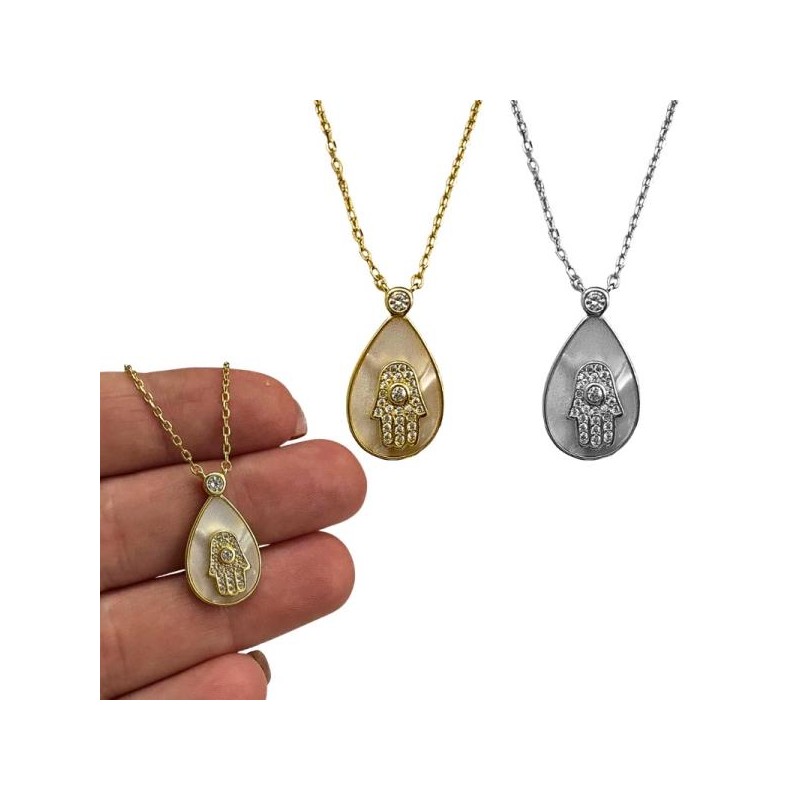 Descubre nuestra gargantilla de plata de ley con colgante Mano de Fátima sobre nácar, disponible en dos acabados: plata o plata bañada en oro de 18K. Un diseño único que combina elegancia y protección. Realizamos entregas rápidas en 24-72 horas laborables en toda la península. Cada joya viene en un estuche de regalo. Disfruta de envíos gratis en compras superiores a 20€.