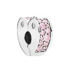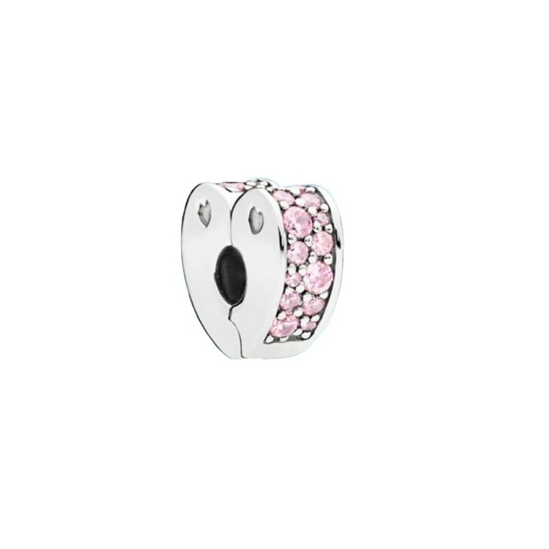 Tope fabricado en plata de ley 925 mm, con cierre de bisagra y clip, y circonitas rosas, en forma de corazón. Compatible con diversas marcas de pulseras como Pandora, por su agujero de 5 mm. Se entrega en estuche de regalo.