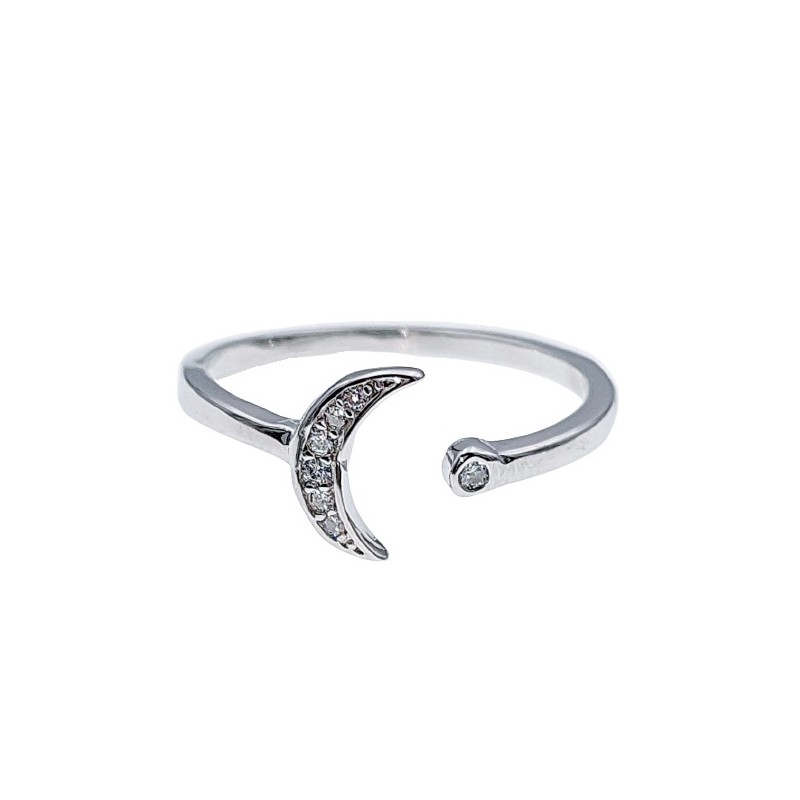 Anillo fabricado en plata de ley 925 mm, bañada en rodio que le aporta mayor brillo. Se compone de una luna en un extremo y una circonita blanca con montura rusa, en el otro extremo. Se entrega en estuche de regalo.