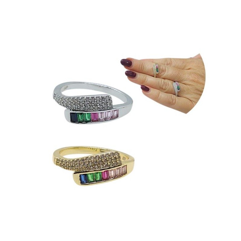 ANILLO PLATA DE LEY CRUZADO CIRCONITAS COLORES Y CIRCONITAS BLANCAS EN SU PARTE SUPERIOR, DOS ACABADOS A ELEGIR: BAÑADO EN ORO 1