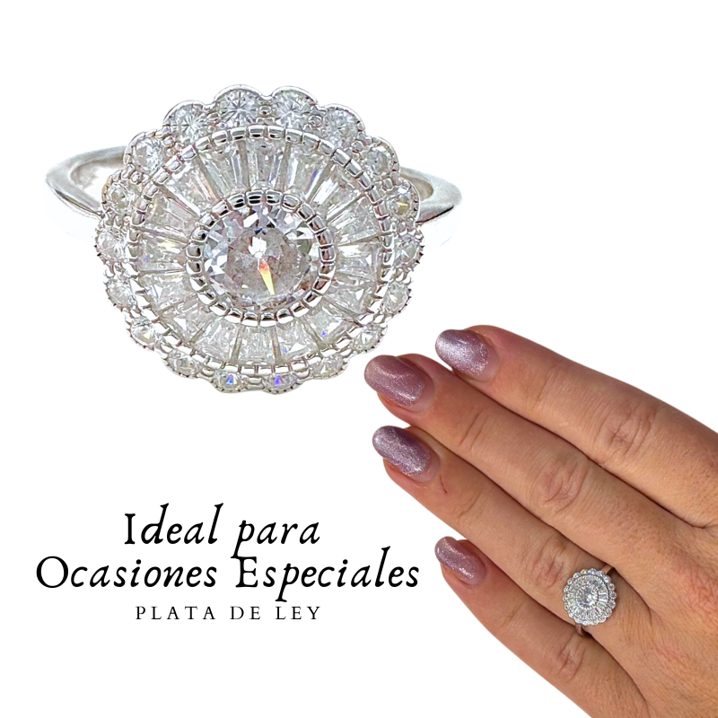ANILLO PLATA DE LEY RODIADO EN FORMA DE FLOR GRADE, FORMADO POR CIRCONITAS BLANCAS, VENTA POR TALLAS