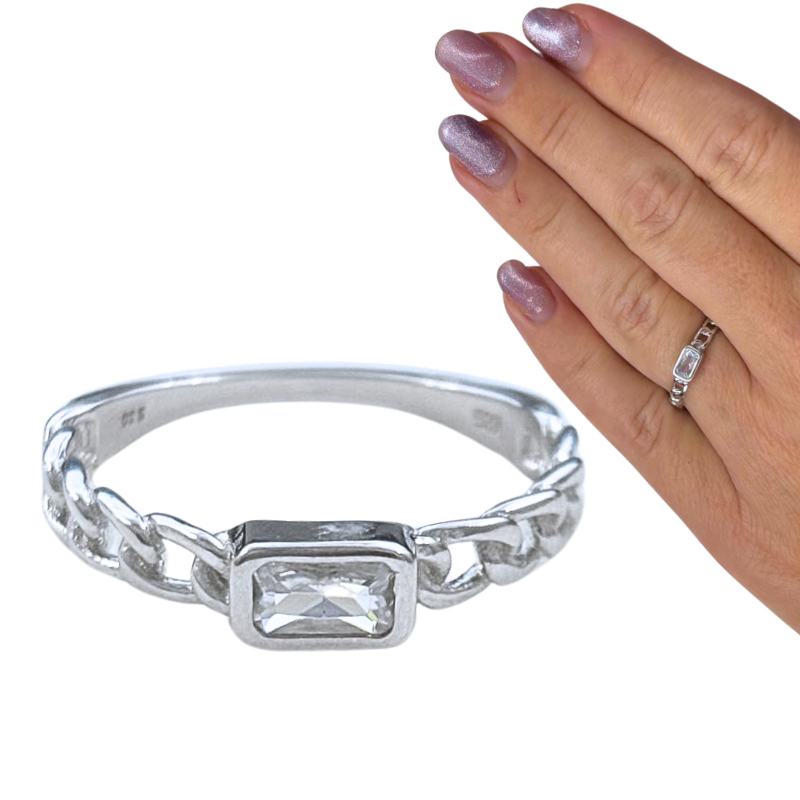 ANILLO PLATA DE LEY TIPO CADENA, CIRCONITA BLANCA RECTANGULAR CENTRAL. VENTA POR TALLAS