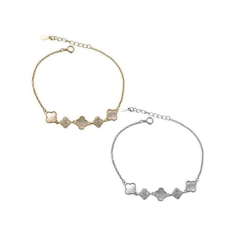 PULSERA PLATA DE LEY TRES TRÉBOLES BLANCOS SEPARADOS POR DOS TRÉBOLES DE CIRCONITAS BLANCAS. RESTO CADENA. LONGITUD 16 CM +3 CM