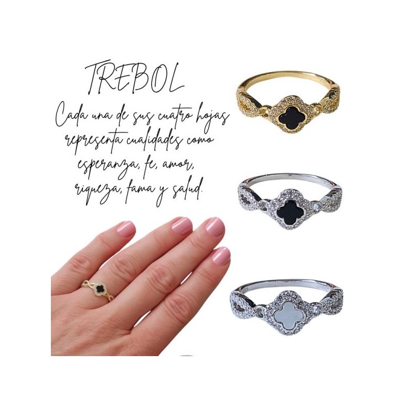 ANILLO PLATA DE LEY RODIADO O BAÑADO EN ORO DE 18K TREBOL NEGRO O BLANCO Y CIRCONITAS