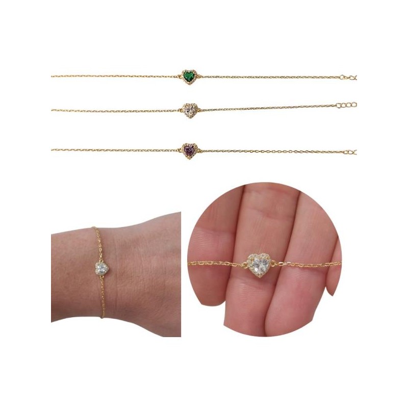 PULSERA PLATA DE LEY BAÑADA EN ORO 18K CON CIRCONITA DE CORAZON DE COLOR Y CIRCONITAS PEQUEÑAS BLANCA ALREDEDOR