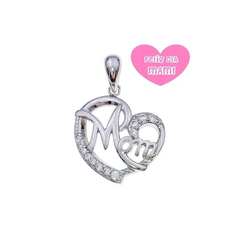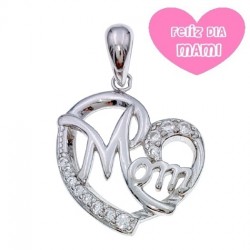 Colgante fabricado en plata de ley con baño de rodio, que le aporta mayor brillo. En forma de corazón, incluye la palabra "Mom" que significa Mamá. Cuenta con circonitas blancas a ambos lados de la palabra. Dimensiones: 1.5 cms de ancho x 2.5 cms de alto. No incluye cadena. Se entrega en estuche de regalo.