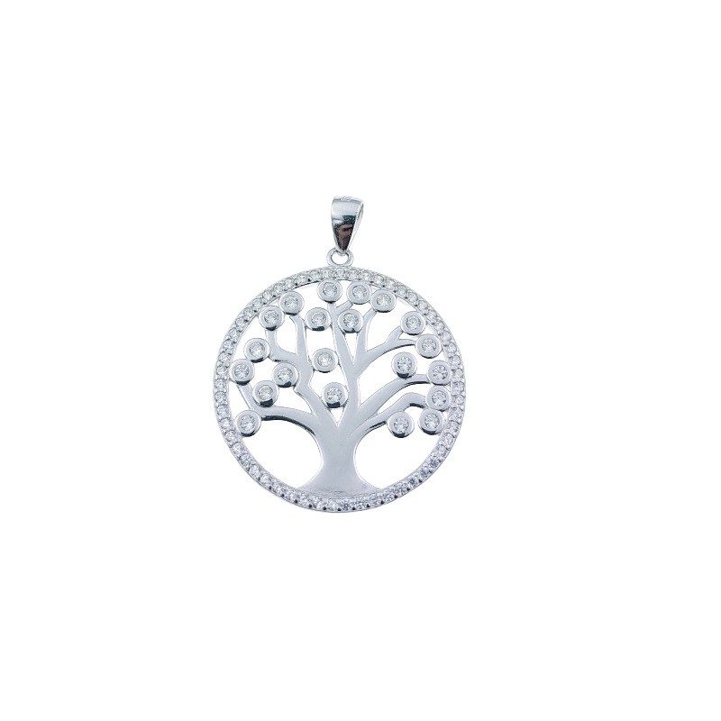 Colgante fabricado en plata de ley 925 mm, en forma circular de 24 mm de diámetro. Cuenta con circonitas blancas por todo el contorno y a modo de hojas del árbol de la vida que se encuentra en el interior. El árbol de la vida, representa la familia, y las raíces. Ideal como regalo. Se entrega en estuche de regalo.