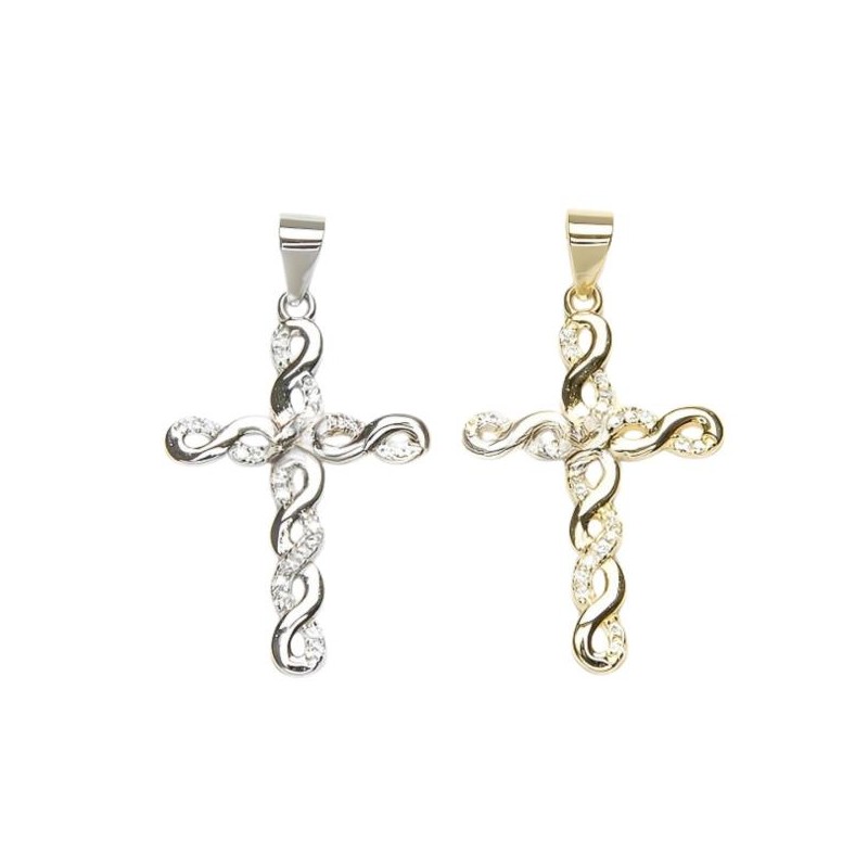 COLGANTE PLATA DE LEY CRUZ ENROLLADA SOBRE SI MISMA, CON CIRCONITAS BLANCAS, 27 X 17 MM, DOS ACABADOS A ELEGIR: DORADA O PLATEA