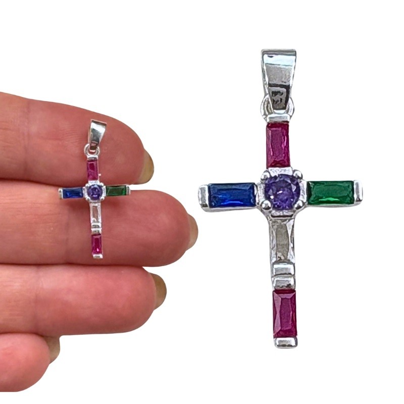 COLGANTE PLATA DE LEY RODIADA CRUZ CIRCONITAS COLORES RECTANGULARES 2 CM ALTO X 1.5 CM ANCHO