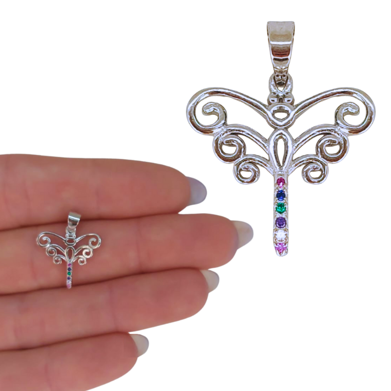 COLGANTE PLATA DE LEY RODIADA CON FORMA DE LIBELULA CON CIRCONITAS DE COLORES