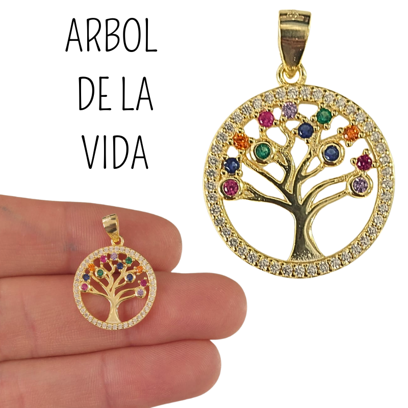COLGANTE PLATA DE LEY BAÑADO EN ORO DE 18K ARBOL DE LA VIDA CON CIRCONITAS DE COLORES Y BLANCAS ALREDEDOR
