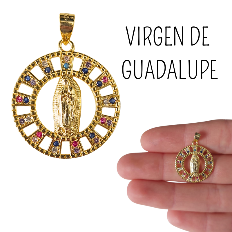 Colgante de plata de ley bañado en oro de 18k con la Virgen de Guadalupe y circonita alrededor, una joya elegante y significativa. Incluye estuche de regalo y entregas rápidas en 24 a 72 horas laborables a península. Envíos gratis para compras superiores a 20 euros y coste de solo 3 euros en pedidos inferiores. Perfecto para regalar o llevar como símbolo de fe y estilo único.