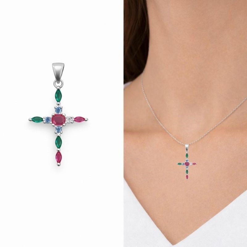 Colgante de plata de ley rodiada en forma de cruz con circonitas de colores que aportan brillo y un estilo moderno. Altura de 28 mm ideal para lucir a diario o en ocasiones especiales. Pieza elegante y versatil. Entregas rapidas en peninsula de 24 a 72 horas. Incluye estuche de regalo. Envio gratis desde 20 euros y 3 euros resto de pedidos