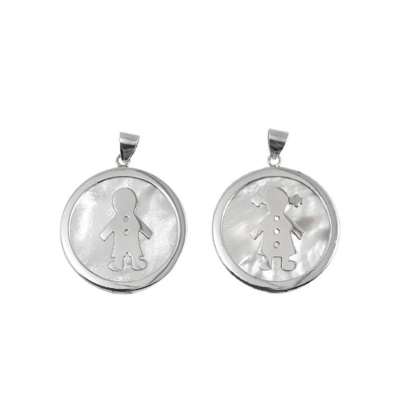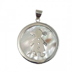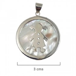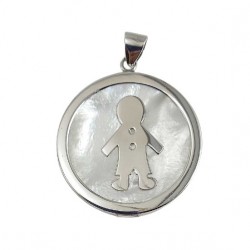 Colgante fabricado en plata de ley 925 mm, con una placa de nácar natural en el fondo y la silueta de un niño o niña, a elegir en el momento de la compra. Se entrega empaquetado para regalo. Dimensiones: 3 cms de diámetro. No incluye cadena.