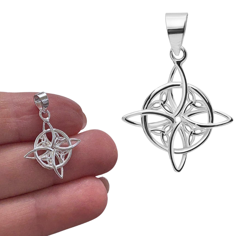 Colgante fabricado en plata de ley 925 mm, en forma de nudo de la bruja, con cuatro triquetas en cada esquina del nudo. Amuleto protector de malas energías. Se entrega en estuche de regalo. Envíos rápidos en 24-48 horas laborables a península. Dimensiones: 19 mm de de alto y ancho.